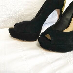 NWOT BRIAN ATWOOD DESIGNER B-RAJA BLACK GOLD EMBROIDERED SUEDE PEEP TOE STILETTO HEELS PATENT PUMPS, a black suede peep toe very high stilleto heel pumps from designer Brian Atwood with a Gold woven embellishment on back of heel. Leather upper and syntetic outsole. Covered platform - FOrmal glamorous pumps, perfect for holiday's seasons and special evening occasions like red carpet, cagals, prom and more.