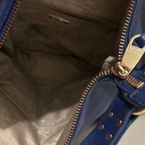 Soft leather navy blue/purple new without tags cross body bag. There's some very slight scuffing on the pull tab from being stored but overall, in excellent condition. Snakeskin print down the center of the bag. Holds a lot for it's size 14' x 16". Interior is clean and has a satin Badgely Mischka logo throughout. Comes with Badgely Mischka original hang tag. Can ve worn as crossbody or over the shoulder as it offers 2 options to carry