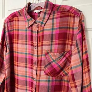 Add a vibrant twist to your casual looks with this soft, lightweight button-down from Beachlunchlounge. The Livvy shirt features a bold multicolor plaid in shades of pink, burgundy, orange, and teal. Designed with a classic spread collar, bust patch pocket, full button front, and button cuffs for a relaxed, timeless look.