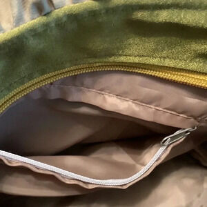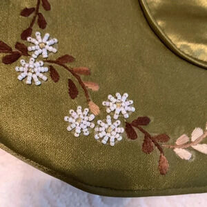 Gorgeous olive green fabric covered handbag with beaded details. Zippered closure. Fabric covered shoulder straps. Interiors pockets. See pictures for measurements. Very unique.