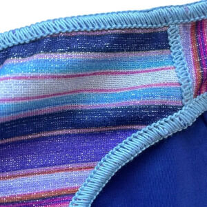 Super cute and new without tags from Becca - the South Coast Hipster Bikini Bottom in "Starry Night Multi". A striking dual-directional striped design, with metallic shimmer. Sits at the hip with moderate coverage. Light blue seam stitching finishes the look.