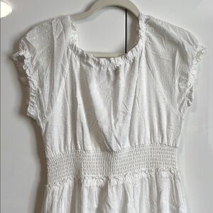 BETSEY JOHNSON white cotton maxi dress with ruffled sleeves. Features layered frills, dots design, smocked elastic waist, v neck and frill elastic sleeve. Fully lined Perfect for summer outings. Lightweight and stylish. New without tags never had a chance to wear it.