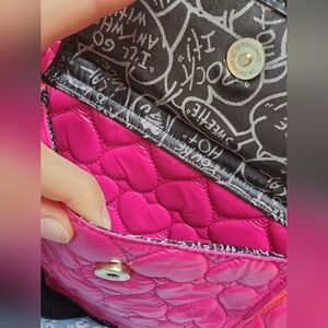 NWOT Betsey Johnson hot pink, red & black quilted hearts crossbody bag. See pictures for measurements. Strap is 49" to the longest (adjustable strap). Excellent condition. Small stains at the front and at the bottom; minor scratches on metal parts as seen on pictures. Front pocket is a bit wavy as seen on picture. Non smoking house.