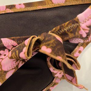 Your bottom is in for a pretty treat with Shelby swimwear. A complimentary brown colour with the sweetest rose color with a ribbon tied to the side.