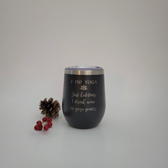 NWOT Black 12 oz stainless steel insulated tumbler with plastic lid, laser engraved with a saying, I DO YOGA. JUST KIDDING. I DRINK WINE IN YOGA PANTS.