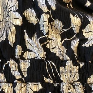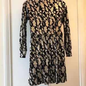 NWOT Vero Moda Faux Wrap long sleeve Dress. Size: Medium. Black with shiny Gold floral design. Measures: Underarm to underarm_ 19". 14.5" waist with elastic waist. Lots of stretch due to Elastane 5% content. Length: 38" from shoulder seam to end of hem. Sleeve length from shoulder to cuffed lower sleeve- 25"