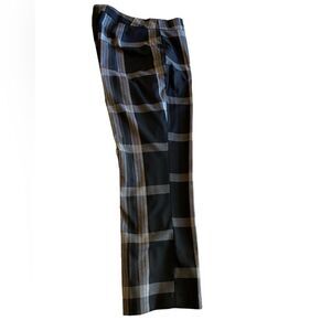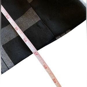 Classic black & white plaid. Wear them with any colour on top. A bit mire fitted at thigh, flare on the bottom. No pockets so they fit smoothly on the hips. They are 64% polyester, 34% rayon and 2% spandex.