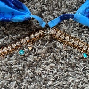 Make a splash with this stunning two-piece blue tie-dyed bikini set in size large, designed to turn heads with its vibrant, ocean-inspired hues. The bikini features eye-catching jeweled accents that add a touch of sparkle and glamour. Please note that some of the jewels show slight tarnish, as shown in the photos, but this does not affect the overall beauty or wearability of the set. Perfect for beach days, pool parties, or tropical getaways!