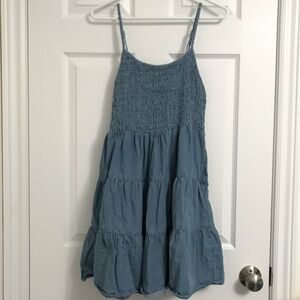 Bluenotes chambray smocked bodice tiered mini dress, denim light blue color, size extra-large, adjustable straps, two side pockets.