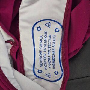 This flattering one-piece swimsuit features a sophisticated deep burgundy color and a classic design that includes ruched front paneling for a tummy control or slimming effect. The plunging V-neckline and detailed criss-cross strap back add style and support. The hygiene liner is intact (as seen in the image).
