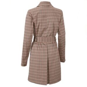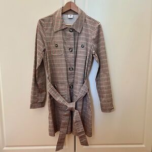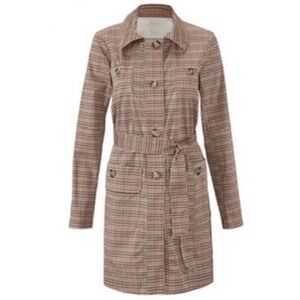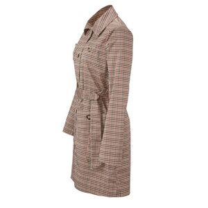 A classic trench shape & houndstooth print give this lightweight transitional piece a touch of old-world charm.