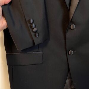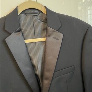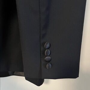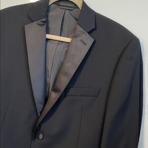 Sophisticated black slim fit tuxedo style men's blazer by Calvin Klein. Ideal for formal events and professional settings. Features a sleek design. Slim fit in 100% wool material with satin like accents including lapel, buttons on closure and arms as well as pocket piping. 2 front pockets. New without tags. This can fit for a women or man.