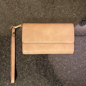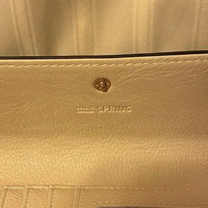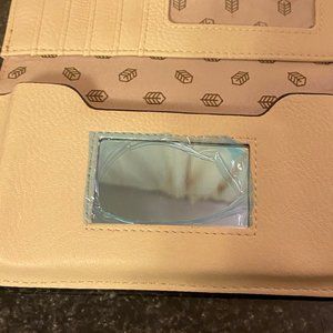 The outside has a darker beige and the inside has a lighter beige! The wallet has a removable wrist strap and a mirror inside.