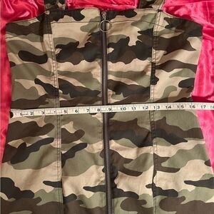 Short, gently fitted bib overall dress in woven fabric. Full zipper at front, wide, adjustable shoulder straps, and a seam at waist.