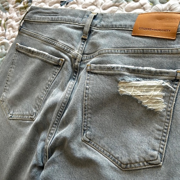 NWOT Citizens of Humanity Emerson Slim Boyfriend Cropped Jean. Style 1797-1386. Super soft and sustainable fabric 59% organic cotton, 40% ecovera, 1% elastane. Made in Turkey. Machine wash. Button fly. Mid Rise. 5-pocket styling. Whiskering and intentionally distressed areas throughout. In light Blue wash “Slushie” Size 25. Approx flat measurements: Waist 14”, Hip 19”, Inseam 22.25”, Leg Opening 6.5”, Rise 9.5”.