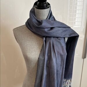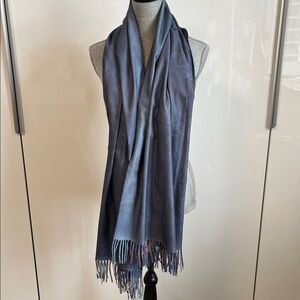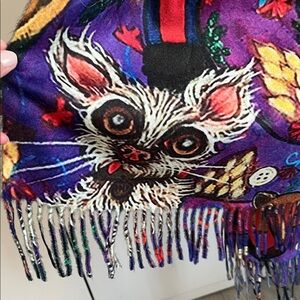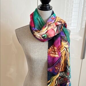Vibrant scarf featuring a unique artistic design with a bohemian lady and animals. Perfect for adding a pop of color to any outfit. Wear on both sides. Double sided. One side has a pretty grey blue color tone and no pattern. Viscose wool blend material with tassels. It's a large size perfect for layering over a wool coat. Such a unique one of a kind scarf. New never worn.
