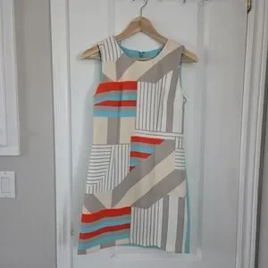 Stand out with this vibrant geometric pattern dress, featuring a mix of red, blue, cream, and gray. Perfect for any occasion.