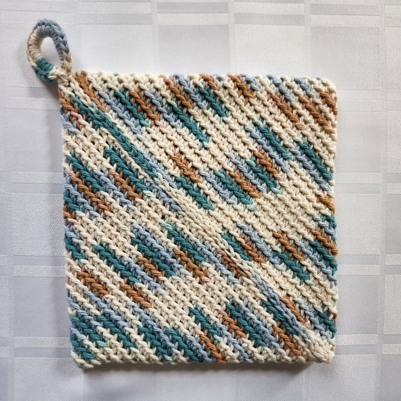 Brand new handmade crocheted cotton hot pad with hanging loop. Two layers thick. White/cream, teal, brown, blue