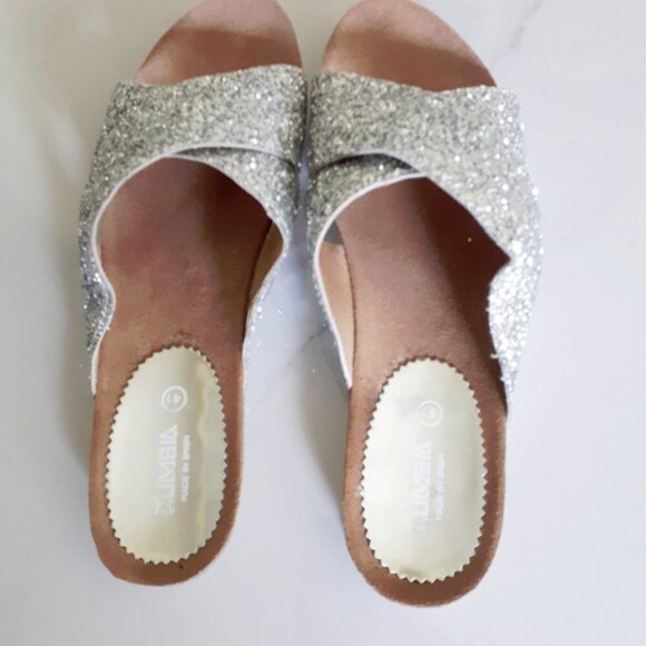 NWOT, never worn, Cumbia silver glitter criss-cross wide strap slide
