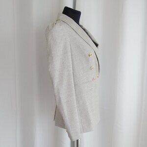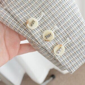 Absolutely stunning tailored blazer from DKNY. In a subtle white/black/beige plaid pattern, this blazer has a similar cut to the iconic Balmain blazer. It features branded DKNY buttons throughout and is fully lined.