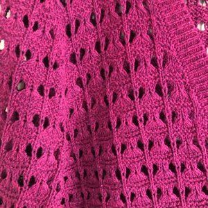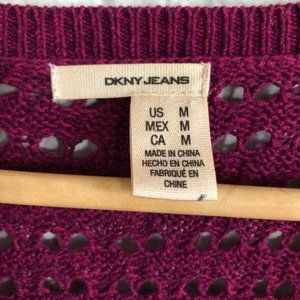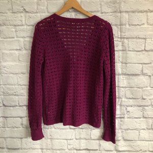 DKNY cardigan sweater. Open crochet look knit in a cotton acrylic blend. Button front, berry purple, V-neck style. Very soft comfortable knit.