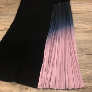 Gorgeous crew neck long sleeve black sweater dress, panel on the side of dress with pleated pink and blue ombré material.