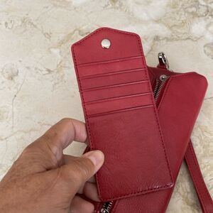 New without tags, cool Damier Leather wristlet wallet. Detachable strap, exterior zippered pocket, main zippered compartment has 3 credit card slots, plus another exterior zippered compartment opens to reveal a detachable (snap) leather flap with 5 credit card slots.