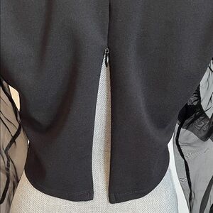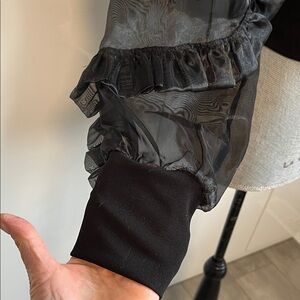 This elegant black top features stylish sheer sleeves with large rosette design on sleeves. Ribbed wrist and fitted stretch body with back zipper closure. Perfect for any occasion. Its chic design adds a touch of sophistication to your wardrobe. A standout piece that looks sophisticated. Wear with a satin trouser pant or your fav pair of denim jeans. New without tag. Made in Turkey.