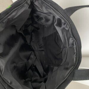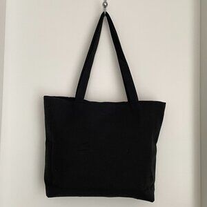 Vibrantly colored embroidered birds and flowers adorn this black canvas tote bag.