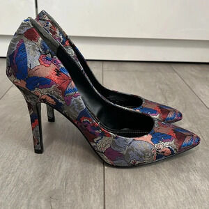 Brand New Metallic embroidered heels in silver with blue and purple colors. 4” heel bonded leather sole. Style these heels with a pair of denim for a girls night out! Size 8