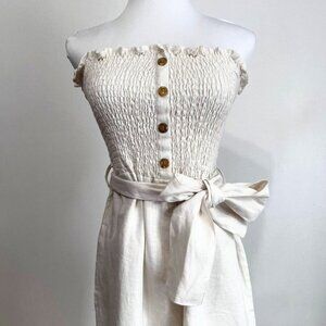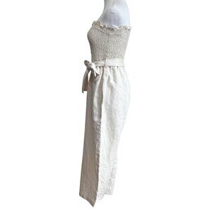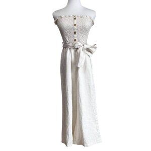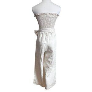FAITHFULL THE BRAND LAIS STRAPLESS SMOCKED BELTED CROPPED WIDE LEG JUMPSUIT, A linen jumpsuit is an all-in-one packing wonder - it frees up your carry-on and saves time spent outfitting. Simply add earrings and your favorite pair of sandals for a chic, seaside look. In bone clor - pullon style - cropped wide leg - belted with belt loops - button detailing on the front (aesthetic only) paperbag style upper hemline - boho-chic, minimalist, coastal, modern and trendy. Must have for summer or vacations.