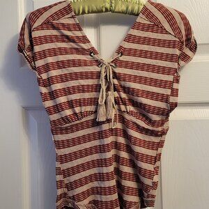 Sweet and funky tee by Free People. Beige and wine stripes with tie up detail / bow at the front with V-neck, as well as V in the back.