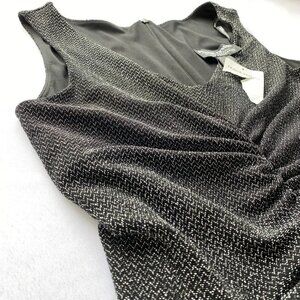 NWOT FRANK LYMAN DESIGN COLLECTION BLACK SILVER METALLIC RUCHED HIGH LOW EVENING DRESS - STYLE 195396, this is a sexy, sensual, feminine, sultry black and silver metallic sleeveless high low evening formal dress with a full back length and a mini front length - sleeveless with a plunge v-neckline - cinched on the front for a flattering touch for the silhouette - tailoreda at waistline- lined and super stretchy for comfort and a bodycon perfect body fit - back zipper fastening, perfect holiday,s seasons, christmas party and new year's eve night out formal dress with lace up sandals or pumps - clutch and silver jewelries. Chic, prom, red carpet, galas appropriate. go to classic chic sophisticated timeless dress from canadian designer Frank Lyman. Local fashion.