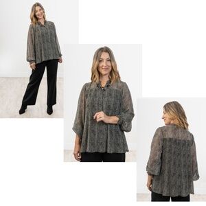 Fransa of Denmark Plisse Blouse in Black Cream Print, so easy to wear and so elegant! Full Sleeve with delicate ruffled cuffs and covered buttons. No Collar with 3 covered button placket. Lined front and back. Beautiful Flowy Plisse Fabric of 100% Recycled Polyester, Lining is 100%Viscose. Made in India. Size Large. Approx flat measurements: Bust20.5”, Shoulders24”, Hip24”, Sleeve24”, Length 26”. Loose, flowy fit. ❤️ Never Worn, Extra Button attached.