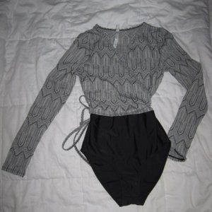 This bodysuit features a breathable chevron knit bodice and sleeves with v-neckline (adjustable to work or lower V neck for a night out) It has a tie waist to adjust to your liking.