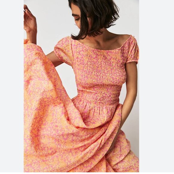 Turn heads in this so special maxi dress featuring smocked top piecing with puffed sleeves and strappy back detailing for added dimension.