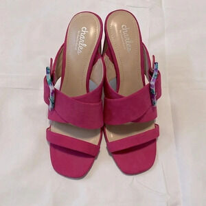NWOT CHARLES DAVID Faux suede heeled sandals with 3.5” heel. Multi colored oversized ornate buckle. New never worn. Size 8 true to size. Microsuede manmade material.