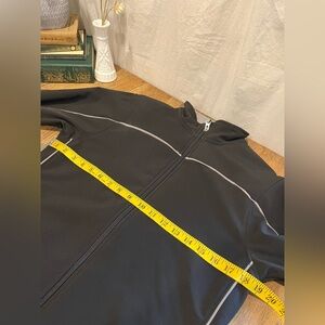 Sporty black jacket with full front zipper, stand-up collar and white piping accents. Lightly structured with a slim silhouette, perfect for walking, cycling, or everyday active wear. Soft inner lining for added comfort and wind protection.