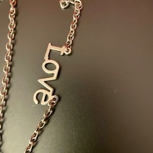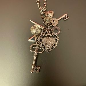 Long (29.5”) silver necklace with cluster pendant, including clear beads, heart and key charms. The chain also has the word “Love” incorporated in the links themselves.