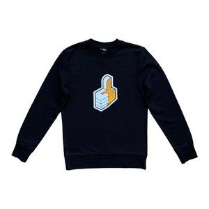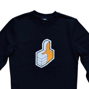H&M Slim-Fit “Thumbs Up” Sweatshirt. Black long-sleeve crewneck made from a cotton-blend fabric. Features a bold graphic print of a stylized thumbs-up icon in pop-art style. Modern, playful, and perfect for casual streetwear.