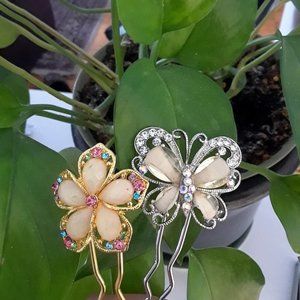 2 Bun Pin flower and butterfly + 1 flower Duck bill Clip