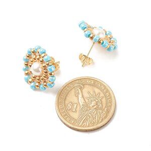 Shell Pearl & Glass Seed Braided Flower Stud Earrings, Golden Stainless Steel Wire Wrap earrings, Light Cyan or turquoise color, 19mm, Pin: 0.7mm