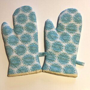 Keywords: Kitchen linens, apron, oven mitts, gloves, matching set, kitchen linens