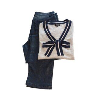 NWOT J Crew Cashmere Sweater in Heather Gray Tie Neck with Blue and White Bow