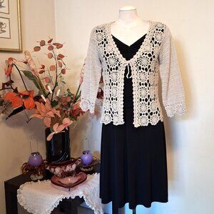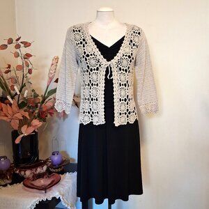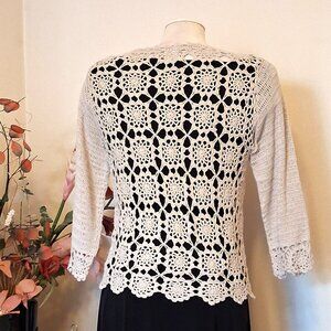 NWOT Jensen Women’s Shrugs Beautiful 3/4 Sleeve V Neck Beige Floral Crochet Knitwear Sweater Blouse Top Size M could fit for 6 or 8
