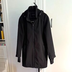 NWOT. Black Softshell Trench Coat for Women Size. Zipper for closure, long sleeves with extended cuffs with thumb holes, removable hood with zipper, 2 pockets with zipper only for style, fleece lined interior. Pictures are part of description.