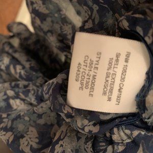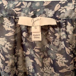 Single snap front closure secures v-neck of beautiful floral blue flowy Joie silk blouse. 3/4 sleeves with elastic waist; peplum hits below hip. Dry clean. Has never been worn.