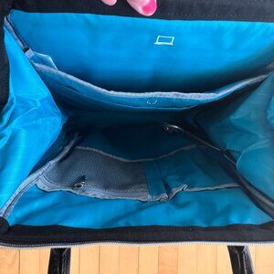 Features: roomy double-zipper closure main compartment, padded compartment that fits a 15.6 laptop, 2 inner pockets, inner secure zipper and outer pockets plus side pockets for a water bottle and umbrella. Bright teal interior so you can see all your things!