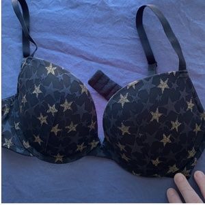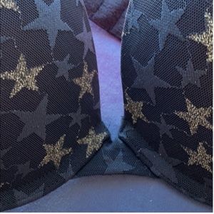 Sassy and glittery with its plunge neckline and sparkly stars. This bra has both an underwire, plunge neckline and pushup padding (not too severe, though). It's a splashy bra!