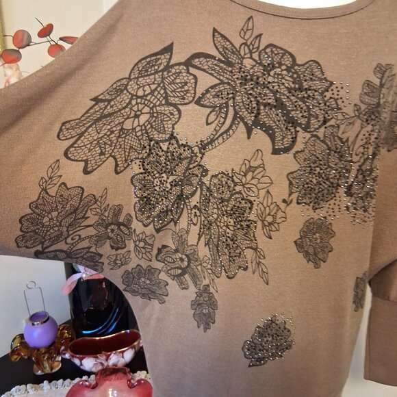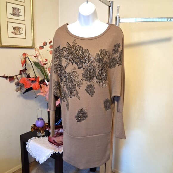 NWOT LUXX Floral Designed Light Brown Stretchy Cardigan Knit Dress Batwing Sleeve Spring Fall Winter Sweater Top Size M fit for 8 or 10
